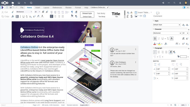 Jobba tillsammans i realtid: Genom att integrerade kontorsverktyg som Collabora Online eller ONLYOFFICE kan flera personer redigera samma dokument, kalkylblad eller presentation samtidigt direkt i webbläsaren. Du ser vad dina kollegor skriver medan de skriver det.