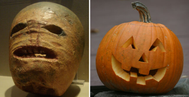 En traditionell irländsk jack-o'-lantern av rova från tidigt 1900-tal jämfört med en modern Halloween-pumpa. Montage. Foto: rannṗáirtí anaiṫnid, David Trinks/CC BY-SA 3.0