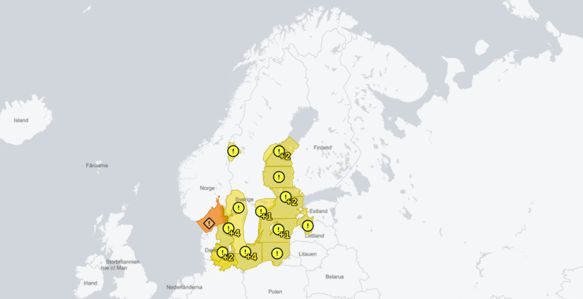 SMHI har utfärdat främst gula varningar för delar av Västra Götaland och sydvästra samt sydöstra Svealand. Bland annat omfattas Skåne, Göteborg, Stockholm, Eskilstuna, Västerås, Karlstad, Halmstad och Jönköping. Även Öland kommer att drabbas, där varningen gäller lördag förmiddag fram till tidig kväll. Vindarna väntas nå 20-25 meter per sekund på Västkusten och upp till 26 meter per sekund på Gotland.